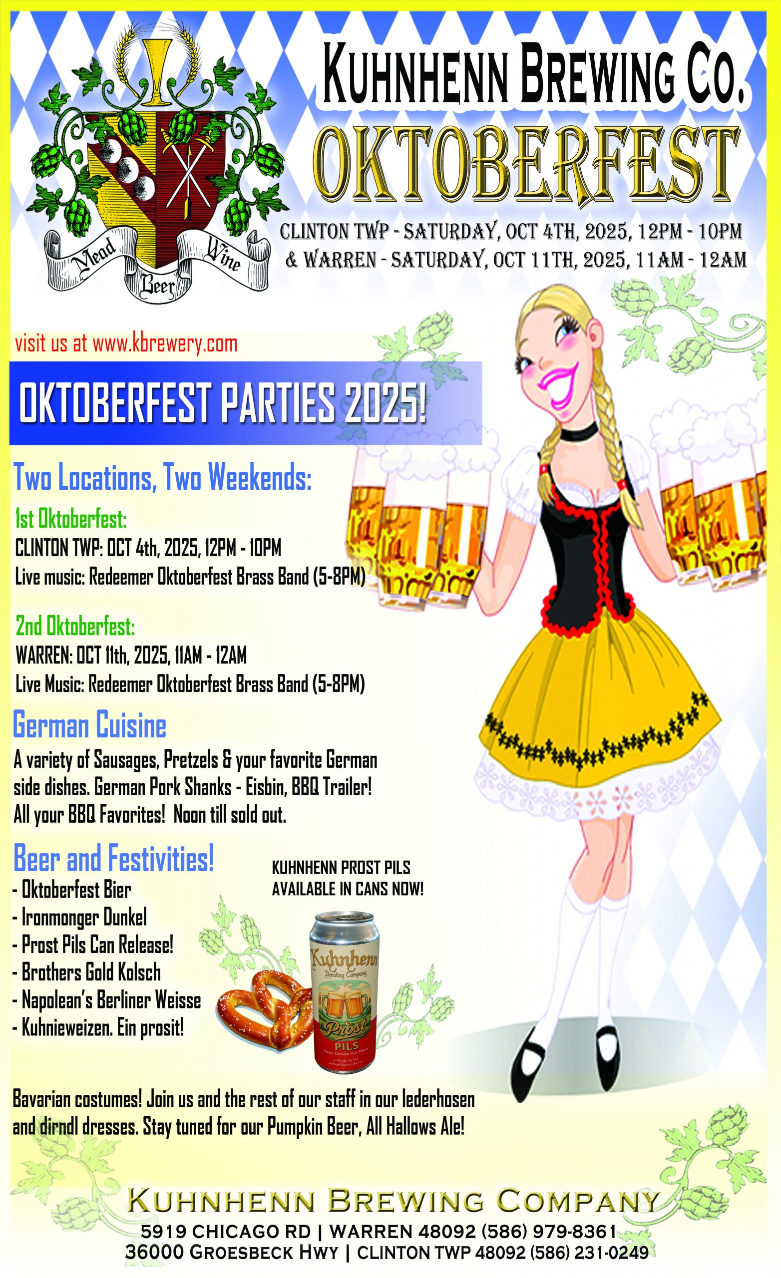 « All Events Kuhnhenn Oktoberfest – Warren October 11 @ 11:00 am - 11:59 pm « Kuhnhenn Oktoberfest Clinton Township Our Oktoberfest party at our original Warren location will be 10/11/25. Add to calendar Google Calendar iCalendar Outlook 365 Outlook Live Details Date: October 11 Time: 11:00 am - 11:59 pm Event Category: PARTY