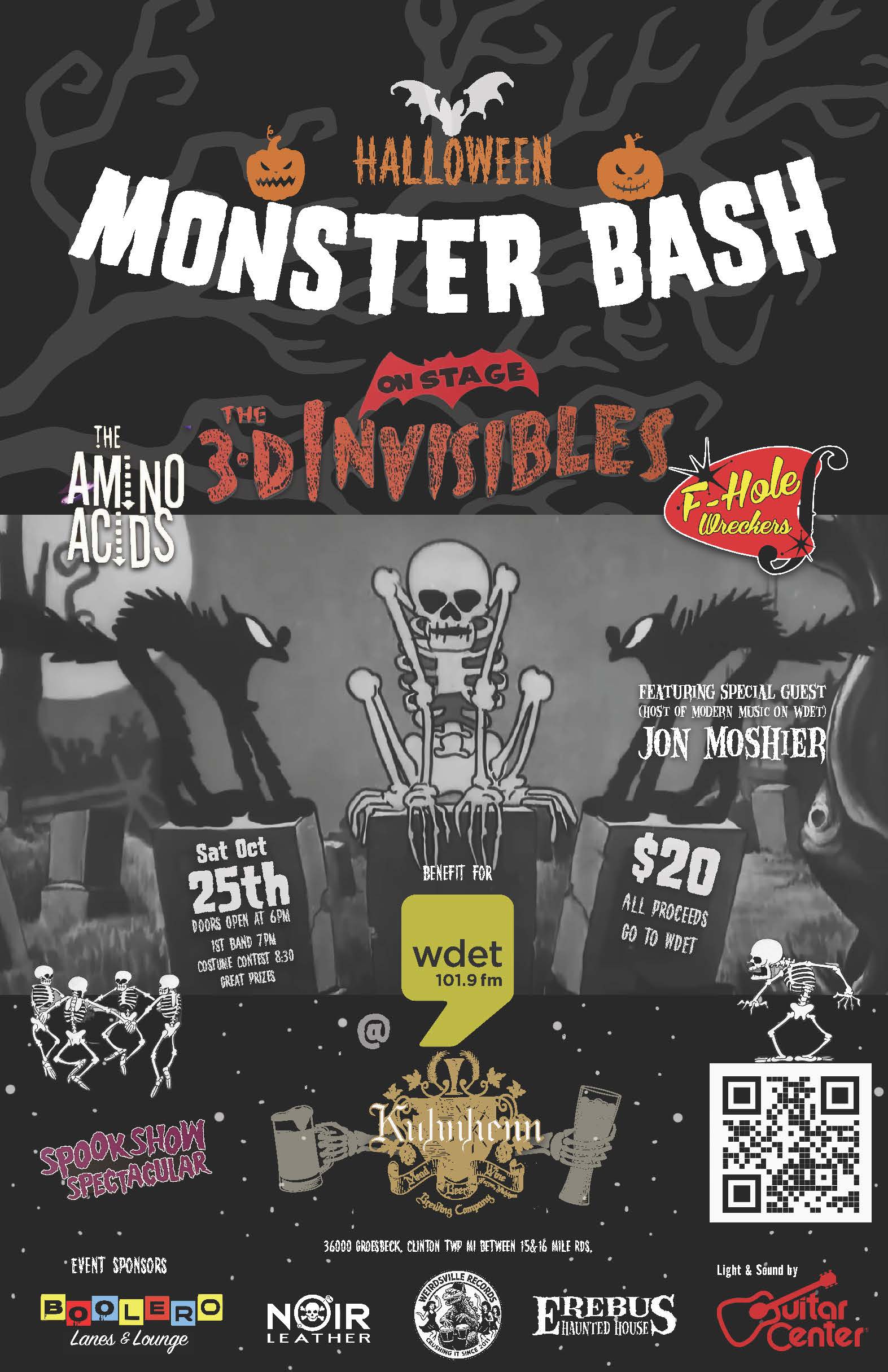 Get your best costumes ready for a night of rock ‘n’ roll mayhem for a great cause! Join us on Saturday, October 25th, at our Clinton Township location for our Halloween Monster Bash. We’ve got a killer lineup featuring the thrilling sounds of The 3-D Invisibles, The Amino Acids, and F-Hole Wreckers, all hosted by WDET’s own Jon Moshier! This event is a benefit for our friends at WDET 101.9 FM. A $20 donation gets you in the door, with ALL proceeds going directly to support the station. Doors open at 6 PM, music kicks off at 7 PM, and the costume contest begins at 8:30 PM. Check out the spooky flyer below for the full lineup!
